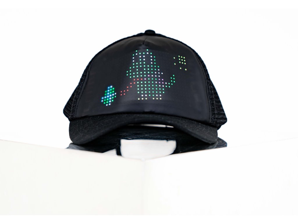 Casquette LED lumineuse, contrôlable via une application mobile et permettant de personnaliser le contenu. Possibilité d'insérer du texte personnalisé.